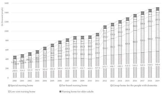 The maximum capacity of care facilities by facility type (2000–2019). Data source: Ministry of Health, Labor and Welfare (2000–2004) []; Cabinet Office (2005–2019) []. Notes: “Special nursing home”: facility for older adults aged 65 and over who are certified as needing long-term care at certified level 3 and above; “Fee-based nursing home”: care facility with a high cost; “Group home for people with dementia”: facility for older adults aged 65 and over who are diagnosed with dementia and are certified at level 1 and above, and those who live in the city where the facility is located; “Low-cost nursing home”: facility for older adults experiencing poverty who are not able to live independently; “Nursing home for older adults”: facility for older adults experiencing poverty aged 65 and over who are not certified as needing long-term care and those who can live independently.
