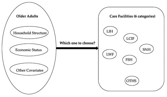 The dependent variable represents the probability of older adults i choosing care facility j from among all six categories. is the household structure of older adult i. is the economic status of older adult i. represents the other covariates.