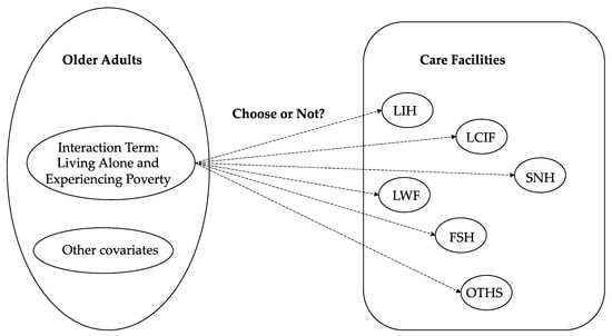 The dependent variable represents the probability of older adults i choosing a particular type of care facility. is the household structure (dummy variable) of older adult i. is the economic status (dummy variable) of older adult i. is the interaction term “Living Alone and Experiencing Poverty”. represents the other covariates.