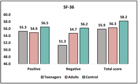 Table 3 and Figure 1 describe the results of the SF-36 questionnaire, comparing teenagers, adult patients, and the control group before intervention and at six months. The SF-36 measures the quality of life across physical and mental health domains, with higher scores representing better outcomes. Before the intervention, the mean physical health scores were similar between teenagers and adults (55.3 ± 7.8 and 54.9 ± 8.0, respectively; p = 0.802), with the control group scoring slightly higher (56.5 ± 7.2). However, there was a significant difference in mental health scores between teenagers and adults (51.3 ± 8.4 and 54.7 ± 7.5, respectively; p = 0.037), with the control group scoring the highest (56.2 ± 6.9). The total scores before intervention did not differ significantly between teenagers and adults (55.9 ± 8.8 and 56.3 ± 7.9, respectively; p = 0.814).