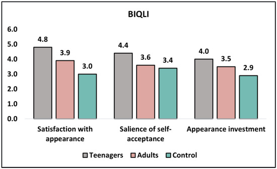 Table 4 and Figure 2 present the analysis of the BIQLI (Body Image Quality of Life Index) questionnaire results before intervention and at six months. The BIQLI measures satisfaction with appearance, the salience of self-acceptance, and appearance investment, with higher scores indicating worse outcomes. Before the intervention, there was a significant difference in satisfaction with appearance between teenagers and adults (4.8 ± 1.9 and 3.9 ± 2.5, respectively; p = 0.045), with the control group having the lowest score (3.0 ± 1.8). The salience of self-acceptance also showed a significant difference between teenagers and adults (4.4 ± 1.8 and 3.6 ± 2.2, respectively; p = 0.051), while the control group had the lowest score (3.4 ± 1.5). However, no significant difference was observed in appearance investment between teenagers and adults (4.0 ± 2.1 and 3.5 ± 1.9, respectively; p = 0.219), with the control group reporting the lowest score (2.9 ± 2.0).