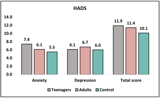 Table 5 analyzes the results of the HADS (Hospital Anxiety and Depression Scale) questionnaire before intervention and at six months. The HADS measures anxiety and depression levels, with higher scores indicating greater levels of anxiety or depression. Before the intervention, there was a significant difference in anxiety levels between teenagers and adults (7.4 ± 2.3 and 6.1 ± 3.8, respectively; p = 0.039), with the control group reporting the lowest score (5.5 ± 3.2). However, there was no significant difference in depression levels between teenagers and adults (6.1 ± 2.5 and 6.7 ± 2.1, respectively; p = 0.203), with the control group scoring similarly (6.0 ± 2.0). The total HADS scores before intervention did not differ significantly between teenagers and adults (11.9 ± 5.0 and 11.4 ± 4.6, respectively; p = 0.607), as seen in Figure 3.