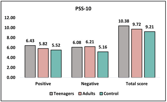 Table 6 presents the analysis of the PSS-10 (Perceived Stress Scale) questionnaire before intervention and at six months. The PSS-10 measures positive and negative perceived stress, with higher scores indicating worse outcomes. Before the intervention, there were no significant differences in positive perceived stress between teenagers and adults (6.43 ± 3.12 and 5.82 ± 3.66, respectively; p = 0.372), with the control group reporting the lowest score (5.52 ± 2.93). Similarly, negatively perceived stress showed no significant difference between teenagers and adults (6.08 ± 2.89 and 6.21 ± 3.14, respectively; p = 0.830), with the control group reporting the lowest score (5.16 ± 2.02). The total PSS-10 scores before intervention did not differ significantly between teenagers and adults (10.38 ± 4.92 and 9.72 ± 4.07, respectively; p = 0.473), as presented in Figure 4.