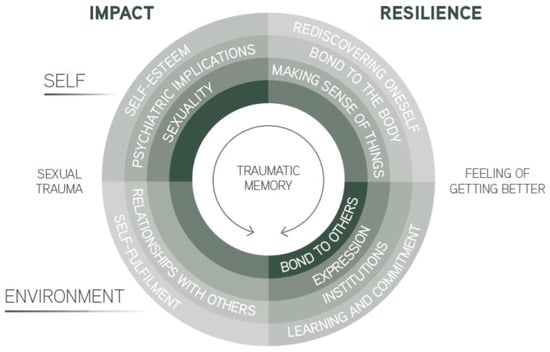 This study aimed to deepen the overall understanding of sexual abuse consequences and to identify common resilience factors, in order to strengthen therapeutic and social care. The collected accounts highlighted the painful and lasting impact of sexual abuse. Feeling like the memory of the abuse remains on the verge of coming back at any time corresponds to what Brewin [19] describes as traumatic memory. It arises in a raw and intrusive way and plunges a person into the sensation of reliving the violent event. According to the study, it occurs during stress-inducing situations and generates great emotional distress [19]. Traumatic memory punctuates the resilience process by causing ruptures that can make a victim feel as though they are returning to the starting point. In this sense, the process of resilience remains in a constant state of flux.