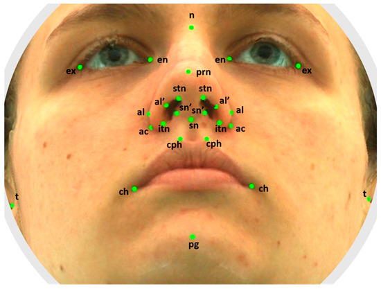 Sixteen linear measurements (Table 2) were made on each image, mostly defined by Farkas [22]. The width and height of the nostril were defined, as described by Altorkat et al., 2016 [1], and the facial width was defined, as described by Cole et al., 2017 [5].