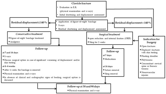 Briefly, a trauma surgeon of our unit first evaluated patients in the ER with a complete clinical examination to evaluate functional impairment of the shoulder, associated injuries of the brachial plexus or the subclavian vessels [30] and chest complications, such as the pneumothorax or hemothorax [31,32,33,34]. The diagnosis was then confirmed with plain X-rays (standard anteroposterior and 20° cephalic tilt views). Then, an F8-B was applied to all patients of our cohort who then underwent immediate radiographic control to check that fragment alignment was achieved. In case of severe RD > 140% after F8-B application, or when reduction was impaired by mechanical factors (soft tissue interposition, comminution or vertical fragments), surgery was suggested (Figure 1). This is because RD was identified as a predictive factor of delayed union and non-union for patients with ADMCFs non-operatively treated (RD of 104% for delayed union and 140% for non-union) in our previous study [27].