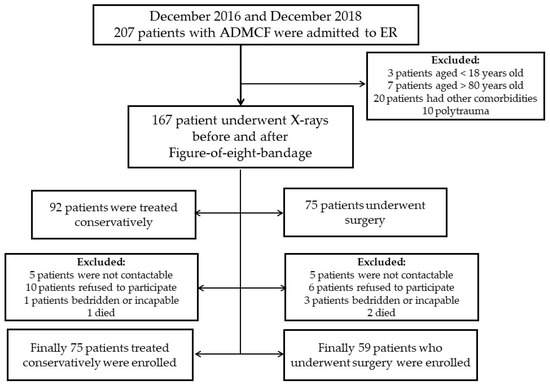 This study was designed as an observational single-centre retrospective case series, including patients affected by an ADMCF between December 2016 and December 2018. Patients were enrolled in the study after receiving a thorough explanation of the risks and benefits of inclusion and providing their written informed consent. The study was approved by the Institutional Ethics Committee (CESC code 319n/AO/22, 15 December 2022) and was performed in accordance with the ethical standards of the 1964 Declaration of Helsinki as revised in 2013 and those of Good Clinical Practice. Inclusion criteria were as follows: active patients with a traumatic, isolated non-pathological ADMCF, between 18 and 80 years old, having followed our institutional protocol for the treatment of their ADMCF, including the rehabilitation program, with at least 1-year clinical and radiographic follow up. Exclusion criteria were patients with an open, stable, undisplaced MCF who had previous injuries of the clavicle or delayed surgery, patients with a bilateral clavicle fracture, patients with significant comorbidities (i.e., rheumatological, oncological, neurological or cognitive types, and systemic infections), patients who refused suggested treatment, polytraumatic patients (having fractures at multiple sites).