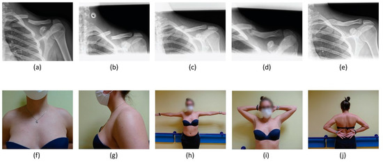 A 24-year-old female patient treated conservatively for an AO A3 left ADMCF. Clavicle radiographic images (a) at the time of patient presentation in ER, (b) at immediate post-reduction radiographic control using a F8-B, (c) at 30-day follow up, (d) at 6-month follow up and (e) at last follow up of 31 months. Last follow-up clinical images showing (f,g) no mass in the supraclavicular fossa and good range of movement in abduction (h), extra-rotation (i) and intra-rotation (j).