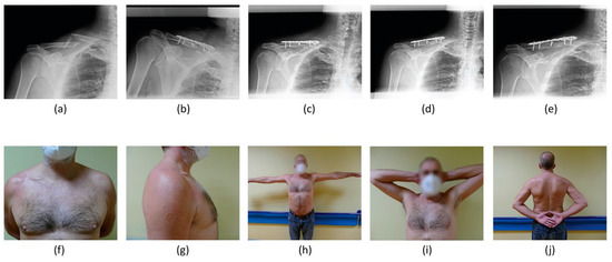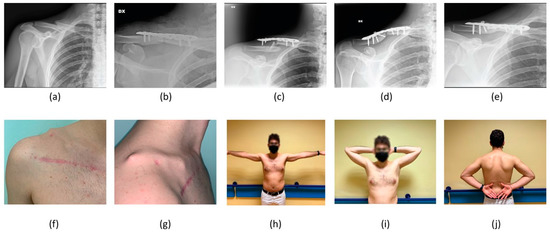 A 59-year-old male patient surgically treated for an AO B2 right ADMCF. Clavicle radiographic images at (a) the time of patient presentation in ER, (b) immediate post-operative radiographic control, (c) 30-day follow up, (d) 6-month follow up and (e) last follow up of 22 months. Last follow up clinical images showing (f,g) a mass of modest size on the right clavicular profile and patient’s satisfactory range of movement in abduction (h), extra-rotation (i) and intra-rotation (j).
