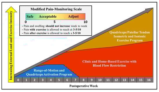 Exercise with BFR was first implemented with light, elastic band resistance or active range of motion exercise with the goal of building to 20–30 min of total occlusion time per exposure (i.e., 4–6 sets collecting 3–5 min of occlusion per set) (Table 1) [28,83]. From weeks 5–7 after ACLR, bodyweight and progressive resistance exercise was permitted/tolerated; sets to volitional fatigue were then utilized to reflect best evidence for hypertrophy-based resistance training [84]. The set volume for the quadriceps muscle(s) progressed from 8 sets/week (postoperative weeks 2–4) to 12+ sets/week (postoperative weeks 5+) of OKC+CKC exercise [84].