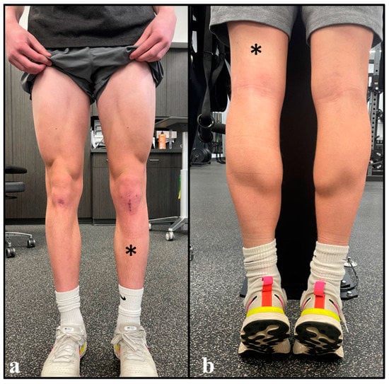 Morphological Appearance of the Lower Extremities 16 Weeks After ACLR. Description: After 16 weeks of clinic- and home-based rehabilitation, objective measurements confirmed the resolution of thigh muscle atrophy within the athlete’s surgical limb (a,b). Asterisks; surgical limb.