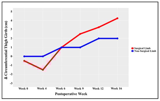 Change in (Δ) Circumferential Thigh Girth. Description: Throughout postoperative weeks 0–16, the athlete efficiently resolved his thigh muscle atrophy and experienced an increase in circumferential thigh girth relative to the non-surgical limb. Y axis; the baseline thigh girth value of the non-surgical limb is used as the “0” point to visualize the between-limb progression of circumferential thigh girth.
