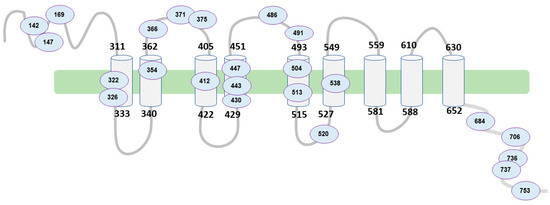 The WFS1 gene encodes for the wolframin protein. Wolframin has three structural domains: an amino-terminal hydrophilic region of approximately 300 residues, a carboxy- terminal hydrophilic region of approximately 240 residues, and a central hydrophobic region of approximately 350 residues containing 9–10 transmembrane segments [7]. According to the AlphaFold database [8,9], wolframin has 890 amino acids and is predicted to have a transmembrane structure composed of nine alpha helices (transmembrane segments) [10] (Figure 1). Wolframin is, therefore, a transmembrane protein that is present in various tissues of the human body. It participates in the regulation of cellular Ca2+ homeostasis since it is involved in the modulation of the filing state of the Ca2+ deposit of the endoplasmic reticulum. In this sense, it negatively regulates the stress response of the endoplasmic reticulum and it increases the stability of the ATP6V1A and ATP1B1 subunits of V-ATPase [11]. Currently, the function of wolframin in the ear has not yet been established, but it has been described as being involved in the ionic exchange at the level of the inner ear [8]. In addition, we know that alterations in this protein pose a high risk of presenting sensorineural hearing loss [12].
