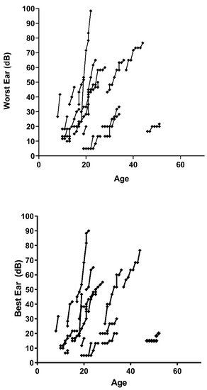 Figure 3 represents the progression of both ears (worst and best) of the decibels perceived by each patient with respect to their age, the first point being the patient’s age at the first follow-up session. The slope differs between the patients, presenting as practically vertical in some cases. In Figure 2, we can see how some patients present a very vertical slope, close to 90° with respect to the horizontal, while others show much less hearing loss by failing to reach a slope of 45°.