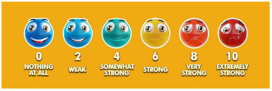 To assess the perception of physical effort before and during the intervention, we used the Rating of Perceived Exertion (RPE). A visual scale was presented to the participants (Figure 1), and they were asked to quantify the sensation of effort at that moment [19]. The visual component facilitates understanding of the question regarding their level of tiredness for children and individuals with cognitive disabilities and refers to the commonly used Borg category-ratio 10-point scale, with the addition of facial expressions (i.e., smileys) for the RPE scores of 0, 2, 4, 6, 8, and 10 [20]. The Physical Activity Guidelines for Americans correlates the RPE classification with the intensity of PA, with moderate-intensity activities scoring 5 or 6 and vigorous-intensity activities 7 or 8 [21].