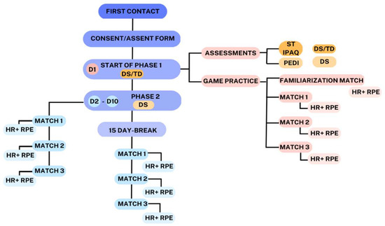 Flowchart of the procedures of the study. D1—Day 1 of the protocol; D2–D10—from day 2 to day 10 of the protocol; DS—Down syndrome; TD—typical development; ST—screen time; IPAQ—International Activity Questionnaire; PEDI—Pediatric Evaluation of Disability Inventory; HR—heart rate; RPE—Rating of Perceived Effort.