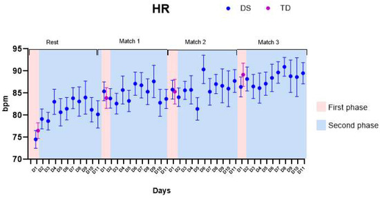 - First phase: No significant differences were found comparing the HR of both groups (the DS group presented average increases of 13.7 ± 2.4 beats per minute (bpm), and the TD group presented average increases of 12.7 ± 3.2 bpm). We found main effects for matches within-groups: both DS and TD enhanced their HR values comparing rest with Match 1 and Rest with Match 3 (p-values and descriptive statistics are provided in Table S1).