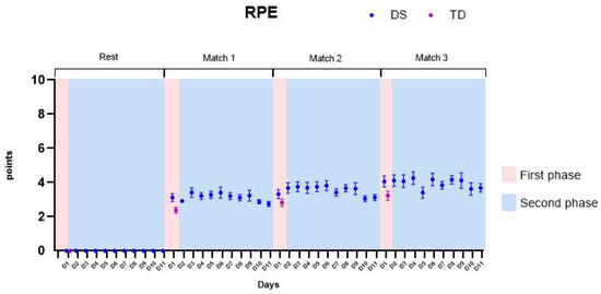 - Second phase: We found significant increases in RPE in the DS individuals when comparing matches. The differences were also found when comparing the first day (D1) and the last day of the protocol (D11), enhancing the RPE. All p-values and descriptive statistics are provided in Table S2.