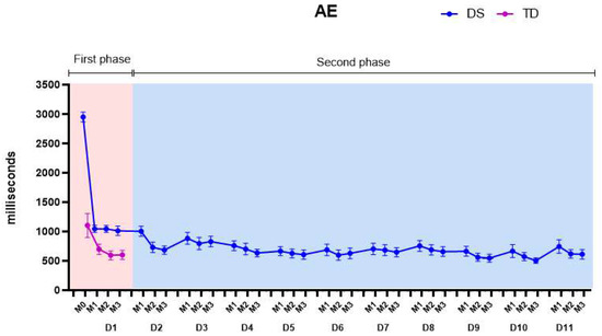 - Second phase: Significant differences were found comparing the days and matches of the protocol. On the fourth day of practice, the AEs of the DS group reached the values of the TD group and maintained the decrease in errors, presenting lower values than the TD group from the fifth day on (639.0 ± 53.2 ms). A significant decrease in the AEs was found comparing D1 with D10 and D1 with D11. All p-values and descriptive statistics are provided in Table S2.