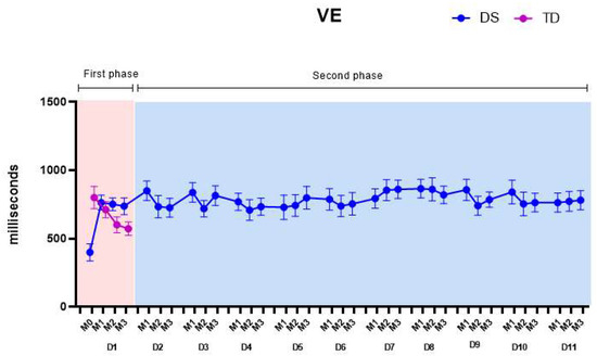 - Second phase: Over the days, the mean VE values of the DS group increased, varying between 770.4 ± 44.6 ms and 849.3 ± 45.3 ms but not reaching the mean values of the TD group (664.6 ± 30.4 ms). These results are further discussed below. All p-values and descriptive statistics are provided in Table S2.