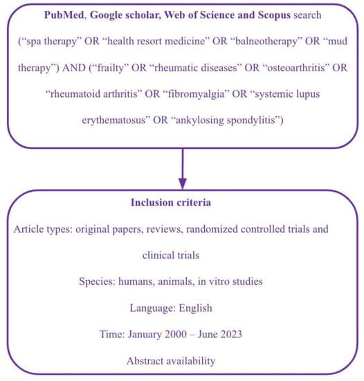 This scoping review followed a five-stage process based on the methodological frameworks proposed by Arksey and O’Malley and Levac et al. [,]. To begin, the research question was formulated by the first author in collaboration with the other authors as follows: What evidence exists regarding the impact of spa therapy on rheumatic disorders and frailty in the literature? Subsequently, a literature search was conducted on Medline (PubMed), Google Scholar, Web of Science, and Scopus by two independent researchers (M.C.M. and A.S.), using keywords such as spa therapy, health resort medicine (which includes “all medical activities originated and derived in health resorts based on scientific evidence aiming at health promotion, prevention, therapy and rehabilitation”), balneotherapy, and peloid therapy, combined with Boolean operators (Figure 1). The eligibility criteria included in vitro and in vivo research, randomized controlled trials (RCTs), or clinical trials that investigated the spa therapy interventions (balneotherapy, peloid applications, etc.) compared to another intervention or no intervention. A thorough process of identifying and selecting relevant studies was carried out. To be included in the review, studies were required to have an available abstract and be published in English. Articles with abstracts written in languages other than English were excluded. The analysis included all original research articles published from January 2000 up to June 2023 (date of last search: 27 June 2023), while case reports, letters to the editor, and studies published before 2000 were excluded. Repetitive studies and those unrelated to the topic were also excluded.