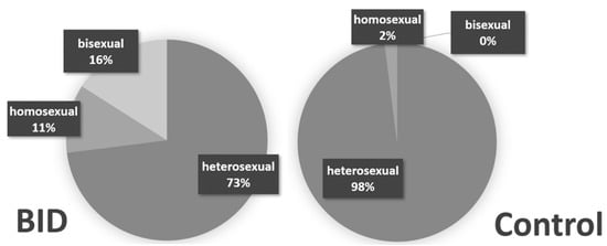 Another point, which probably causes headaches not only for the experts, is a strange gender influence as well as erotic undertones of BID. In the primeval days of the symptoms, which were then referred to as “apotemnophilia” or BIID, it was said that there were predominantly male homosexuals. This number has decreased significantly, more and more women and heterosexual fathers have been added; as data from the study by Diana Becker from our group (see Figure 4) show, but still—for unknown reasons—the proportion of homosexuals and bisexuals is nevertheless significantly higher than in the general population [11].