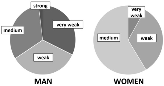 There are also overlaps between BID and a certain paraphilia, which is usually referred to as “mancophilia” (love of deficiency), but also referred to as, with an ugly term, “deformation fetishism”. Most of those affected are men, and in particular the sight of amputation stumps leads to sexual arousal. Countless photos are offered in appropriate forums on the Internet, e.g., for masturbation. Many sufferers try to get to know a partner who has an amputation. In 2013, Lea Pregartbauer [14] from our lab asked people affected by BID about this erotic component. After all, around 61% admitted that amputations also contain a strong sexual component, 17% admitted a moderate participation, but on the other hand, 22% said that they felt no erotic interest in amputations. However, their work included only 18 BID participants. In 2020, Elmas Özelik [15] repeated this question in her work, but came up with significantly weaker numbers. Around a third of the participants had a very weak, weak or medium sexual component, and hardly anyone had a strong erotic interest. Women predominantly had medium or weak erotic involvement (see Figure 6).