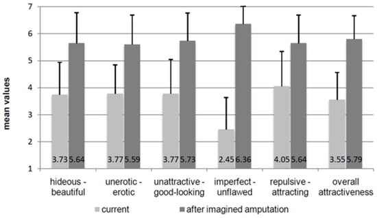 In conversations with those affected, it became obvious that amputees were simply considered as more beautiful and attractive than people on two legs. In 2018 Lisa-Lucie Aner [21] from our group showed BID-affected persons pictures of people in the complete state and with missing arms and legs. In fact, those affected by BID rated the pictures with amputees as more attractive and beautiful. In the second part of her work, the participants were asked to rate themselves in their current (non-amputee) condition on bipolar scales (e.g., not attractive–good looking) and then give the same rating again for the desired disability. Figure 7 shows very clearly that the appearance after the loss of the body part is rated as significantly more attractive and erotic [21].