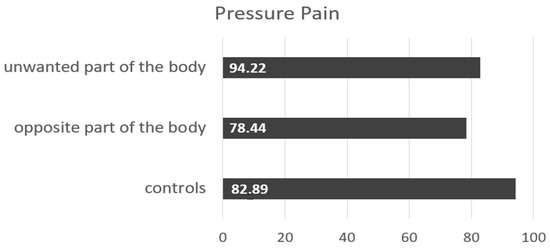The research of Maryam Tabesh in 2023 deals with the pain perception in patients with body integrity dysphoria [22]. In her primary interest was the question of whether the pain perception differed between the wanted and unwanted limb. A sample of 10 participants were divided into two groups: BID sufferers (n = 5) and a matched control group (n = 5). Three different measuring instruments were taken to investigate the pain threshold. The pressure gauge FDN 200 was used for the pressure pain; the TSA2 Medoc was used for cold and heat pain and for touch sensitivity, Opti-Hair2 filaments were applied. The results of her investigation revealed significant correlations between heat pain threshold comparing the wanted and unwanted limb of the BID patients (p = 0.036), as well as the comparison between BID patients and the control group (p = 0.041, see Figure 8).