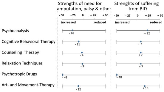 Unless we find the cause for BID, it is difficult to propose a therapy. Still, the question that is perhaps most helpful for all those affected would be whether and how one can get rid of the suffering caused by BID. Some of them say they would very much like to keep their leg and get rid of the BID pressure; for others, it is part of their personality. In 2014 Katharina Kröger [25] asked the participants in her study about their experiences with different types of psychotherapy, including pharmacological treatment. Most of the procedures (behavioural therapy, talk therapy, relaxation techniques) were of practically no use; deep psychological or psychoanalytic treatment at least reduced the psychological strain caused by the urge for amputation, paralysis, etc. Psychopharmacological medication was unanimously assessed as negative. Body-oriented forms of treatment were judged quite differently, but many, who had tried them, noticed that the psychological strain caused by the mental focusing on their own body increased rather than decreased (see Figure 9).