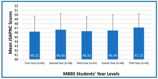 Based on the JSAPNC instruments’ scoring algorithm, the higher the score, the more favorable the respondents’ attitudes were toward physician–nurse collaboration. Figure 1 displays the mean ratings of the medical students’ attitudes toward collaboration between doctors and nurses in a hospital setting. According to the results, first-year medical students have the lowest JSAPNC mean score (46.22), while fifth-year medical students have the highest (47.15). The findings of this study revealed that fifth-year medical students had a more positive attitude toward collaboration compared to the lower years, except for the second year, who scored higher than the third- and fourth-year students.