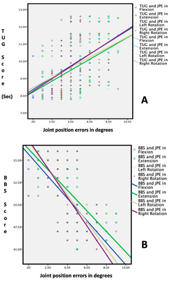 Correlation between cervical proprioception errors and functional balance tests: (A) Berg balance test score vs. joint position errors; and (B) Timed Up and Go test vs. joint position errors.