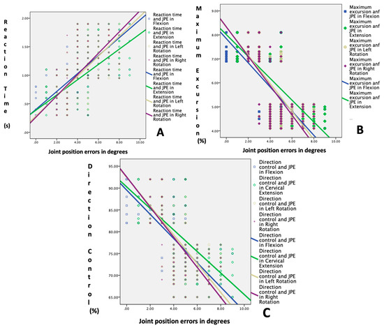 Correlation between cervical joint position errors and LOS tests: (A) reaction time (sec) vs. joint position errors; (B) maximum excursion % vs. joint position errors; and (C) direction control % vs. joint position errors.