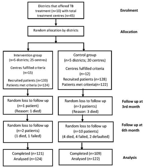 Simple randomization was performed at the district level with a 1:1 allocation ratio generated using the random sequence number generator. The unit of randomization was the district, but the intervention program was specifically targeted at the patient’s level to avoid contamination of the intervention effect. A sampling of patients at the selected centers was not feasible due to the limited number of eligible patients, thus all eligible TB/DM patients from the centers were invited to participate. Since the trial was conducted in a routine healthcare setting, the allocation to intervention and control groups was not concealed from the top administrative person, TB nurses, patients, and assessor.