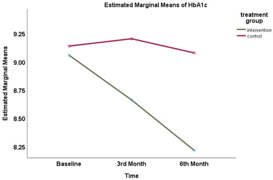 Profile plot of the mean HbA1c for each group for baseline, 3rd month, and 6th month of intervention.