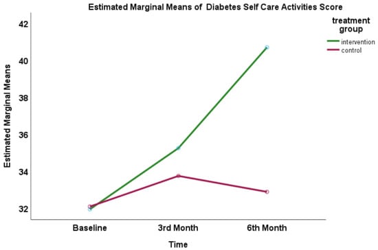 There were significant mean differences between baseline, 3rd, and 6th month within the group over time as well as between the intervention and control groups. Both groups had an improvement in self-care scores after 6 months, but the improvement was higher in the intervention group (mean difference 3.01, 95%CI: 2.51, 3.59; p < 0.01). There was an interaction between groups and time (time-group interaction effect). The partial eta square for the intervention effect was 0.33 and time effect was 0.52, indicating a large effect size (Figure 3).