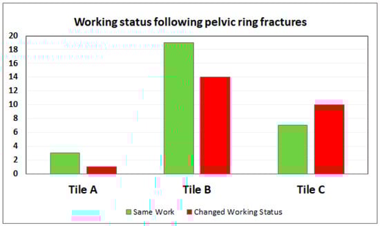 - Aprato, A.; Joeris, A.; Tosto, F.; Kalampoki, V.; Rometsch, E.; Favuto, M.; Stucchi, A.; Azi, M.; Massè, A. Are Work Return and Leaves of Absence Predictable after an Unstable Pelvic Ring Injury? J. Orthop. Traumatol. 2016, 17, 169–173. [Google Scholar] [CrossRef] [PubMed]
