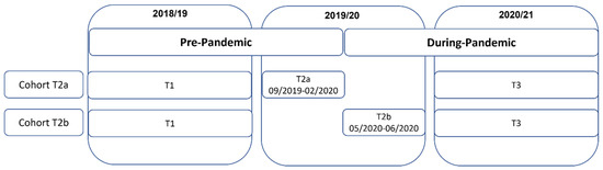 An anonymous unique identification code was created for students using information from five questions asked at the beginning of the questionnaire to link student data across study waves [24]. As shown in Figure 1, data were linked between three years to construct two cohorts: Cohort T2a includes students who provided linked data between T1, T2a, and T3 (n = 3467) while Cohort T2b provided linked data between T1, T2b, and T3 (n = 1900). Figure 1 indicates that both cohorts participated in all three waves of data collection, and the only difference between them is that Cohort T2a only includes students surveyed before the onset of the pandemic in T2a, while Cohort T2b only includes students surveyed after the onset of the pandemic in T2b.