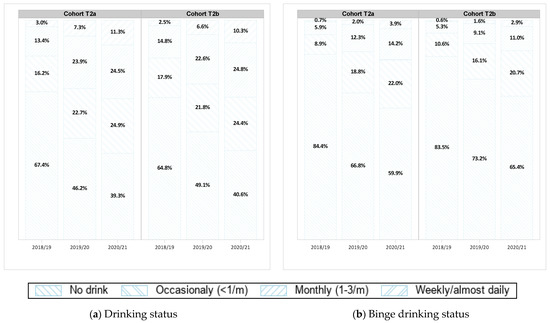 Changes in the size of drinking statuses from (a) pre-pandemic 2018/19 (T1) to early-pandemic 2019/20 (T2) and (b) from early-pandemic (T2) to ongoing-pandemic 2020/21 (T3) by cohorts. Cohort T2a consists of youth who provided linked data in 2018/19, September 2019 to February 2020, and 2020/21. Cohort T2b consists of students who provided linked data in 2018/19, May 2020 to June 2020, and 2020/21.