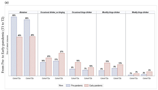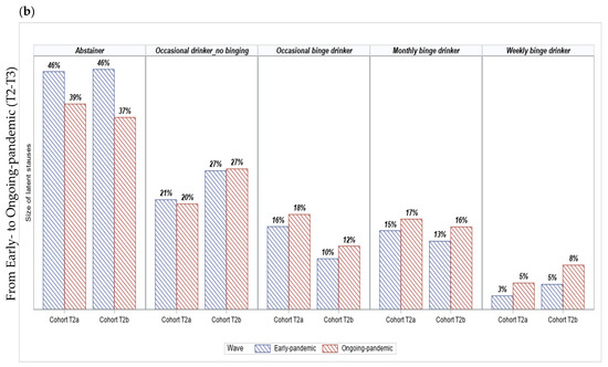 After examining the stability of classes over the three-year study period, Figure 3a shows changes in the size of the five latent statuses between the two cohorts. From pre-pandemic to early-pandemic, the proportion of abstainers that maintained their abstinence was similar in both Cohort T2a and Cohort T2b. The escalation in the proportion of Cohort T2b students who were engaged in occasional binge drinking (from 7% to 10%) was lower than the escalation among the Cohort T2a students (from 8% to 16%). The increase in the proportions of monthly binge drinkers more than doubled among Cohort T2a students (from 6% to 15%), while it only increased 1.5 times (from 9% to 13%) among Cohort T2b students. In contrast, the size of weekly drinking and binge drinking in Cohort T2b increased slightly more than that of Cohort T2a. It appears that changes in the size of latent statuses of the two cohorts from T2 to T3 were similar (Figure 3b).