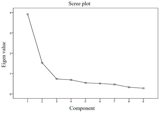 The KMO and Bartlett sphericity test values were checked to verify EFA; the KMO value was 0.81, and the Bartlett sphericity test value was x2 = 496.25, p < 0.001. These values were appropriate because KMO is greater than 0.6, and Bartlett’s sphericity test value is p < 0.05 [,]. EFA was conducted, and the result was extracted as two factors. One factor comprised questions 1, 2, 3, 4, 5, 7, and 9. Question 3 was reverse-scored. The other factor was composed of reverse-scored questions 6 and 8.