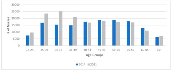 Age distribution of employed nurses in Ontario, 2014 and 2021. Source: College of Nurses of Ontario (2022). Registration statistics report [18].