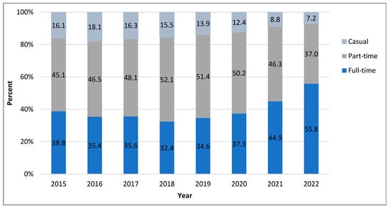 Work status of new nurses in Ontario, 2015–2022. Source: College of Nurses of Ontario (2022). Registration statistics report [18].