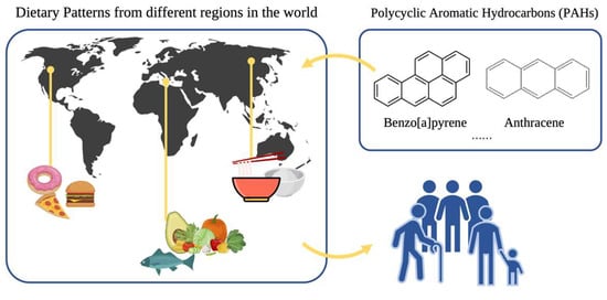 This article reviews the content of PAHs in food, the daily intake of PAHs in humans, their dietary characteristics, their relationship with the human daily intake of PAHs, and their impact on cancer risk. The ingestion of food-source PAHs occurs through the gastrointestinal tract and is stored in adipose tissue. Due to its fat solubility and lipophilicity, rendering their elimination is an arduous task. Therefore, the prevention of PAHs is critical. Sources of PAHs present in food include soil, air, marinades, cooking techniques, external factors during smoking, and food packaging []. To reduce the indirect impact on food products, it is imperative to impose more rigorous regulations pertaining to food safety in regions where elevated levels of PAH contamination have been identified, and to eradicate environmental PAHs. For regions that prefer heavy oil and salt, the most efficient way to prevent PAHs may be enhancing education on healthy diet concepts; using more steaming and stewing methods instead of smoking, frying, and grilling; reducing the frequency and quantity of fried and fat-rich foods to avoid excess amount consumption.
