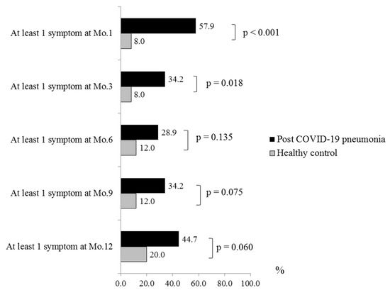 During a follow-up visit, the post-COVID-19 pneumonia patients had at least one symptom in 57.9%, 34.2%, 28.9%, 34.2%, and 44.7% at 1-month, 3-month, 6-month, 9-month, and 12-month visits, respectively. The number of patients with at least one symptom was significantly higher than healthy control subjects at 1-month and 3-month visit (p Value < 0.001 and p Value = 0.018, respectively). From month 6 to month 12, the number of patients with at least one symptom was also higher than healthy control subjects but not significant. Cough and fatigue were the most common symptoms (Figure 1 and Figure 2). The overall symptoms resolved over time but rebounded at months 9 and 12 (Figure 1). A similar trend was observed in patients who only had cough symptoms (Figure 2).