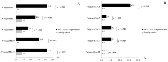 The Long-Term Impact of Post-COVID-19 Pneumonia on Symptoms of Cough (A) and Fatigue (B). Abbreviation: COVID-19, coronavirus disease 2019.