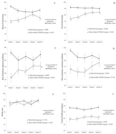 Health-Related Quality of Life Measured by SF-36 during follow-up period in post-COVID-19 pneumonia patients compared to healthy controls. Physical functioning (A), social functioning (B), role limitations physical problems (C), role limitations emotional problems (D), bodily pain (E), general health perceptions (F), mental health (G), and vitality (H). Note: Data are presented as mean ± SEM; * p Value < 0.05 compared to healthy controls; # p Value < 0.05 compared to month 1 visit. Abbreviations: COVID-19, coronavirus disease 2019; SF-36, 36-item Short-Form Health Survey.