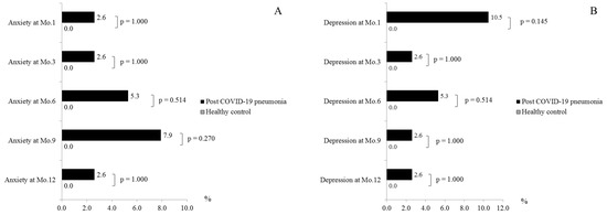 There was no significant difference between anxiety and depression between post-COVID-19 pneumonia patients and healthy control subjects. A few post-COVID-19 pneumonia patients had an anxiety, defined by HADS-A score ≥ 11, [1 (2.6%), 1 (2.6%), 2 (5.3%), 3 (7.9%) and 1 (2.6%) patients] or depression, defined by HADS-D score ≥ 11, [4 (7.9%), 1 (2.6%), 2 (5.3%), 1 (2.6%) and 1 (2.6%) patients] at months 1, 3, 6, 9, and 12, respectively (Figure 4). No healthy control subjects had anxiety or depression.