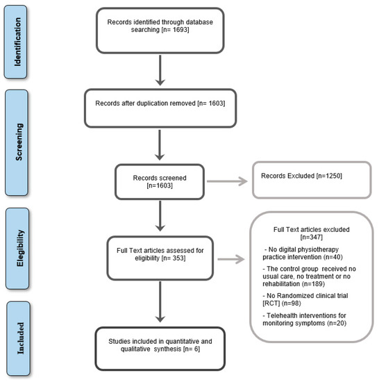 In line with the PRISMA guidelines, the inclusion and exclusion criteria were established through the definition of the PICO (population, intervention, comparison, and assessment) strategy. The PICO acronym (Patient/Population–Intervention–Comparison/Comparator–Outcome) [27] was used with the intention to answer the research question: Is the practice of digital physiotherapy effective to improve clinical outcomes in patients with Long COVID compared to usual care?