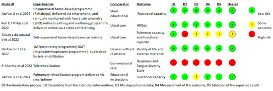 With regard to the variety and modalities of digital interventions, and despite the variety and quantity of available alternative models implemented globally [53], this review shows scarce intervention alternatives. Tele-supervised home-based exercise training was the most commonly used method. No other digital physiotherapy practices, such as artificial intelligence, virtual reality or video games, currently in common use met the inclusion criteria for this review [54,55,56].